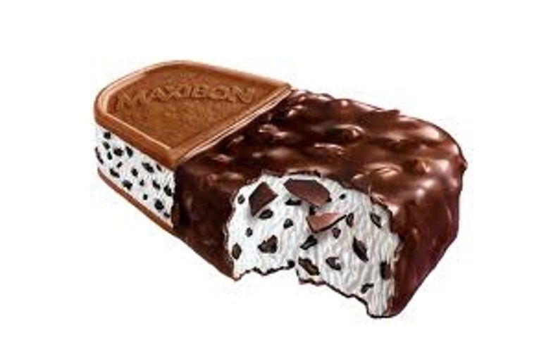 Gelato alla vaniglia con pezzetti di cioccolato rivestito da uno strato solido di crema al cacao con frammenti di nocciola da una parte e racchiuso tra due fette di biscotto morbido dall'altra.