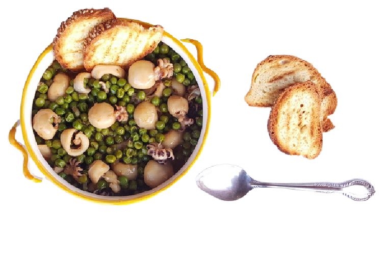 Seppioline in umido con sugo di piselli e pomodoro.