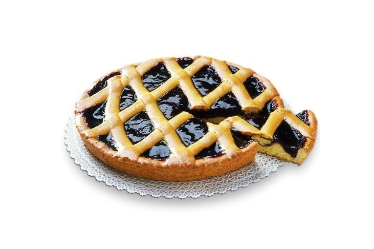 BASE DI PASTA FROLLA MARMELLATA DI MIRTILLO DECORATA CON RIGHIE DI PASTA FROLLA INCROCIATE RICOPERTA DA GELATINA.