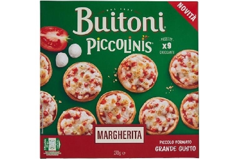 Ingredienti : Farina di FRUMENTO, acqua, MOZZARELLA 16%, semi-concentrato di pomodoro (11%), pomodoro in pezzi (10%), olio di colza, lievito, zucchero, pasta acida essiccata (FRUMENTO), sale, amido, erbe aromatiche e spezie, destrosio, estratto di spezie. Può contenere: UOVA, PESCE, LUPINI, SEDANO, SENAPE e SOIA. N FORNO STATICO 1. Preriscalda il forno fino al raggiungimento di 200°C 2. Rimuovi le pizzette dal congelatore e dall'involucro di plastica e posizionale sulla griglia al centro del forno 3. Cuoci per almeno 13 minuti a 200°C